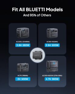 Le Charger 1 est compatible avec tous les modèles BLUETTI (AC70, AC180, AC200L, Elite 100 V2, Elite 200 V2, AC300, AC500…) et 95% des stations d’énergie d’autres marques. Il utilise une connexion MC4 standard via le port d’entrée solaire. La tension est réglable pour s’adapter à différents modèles.