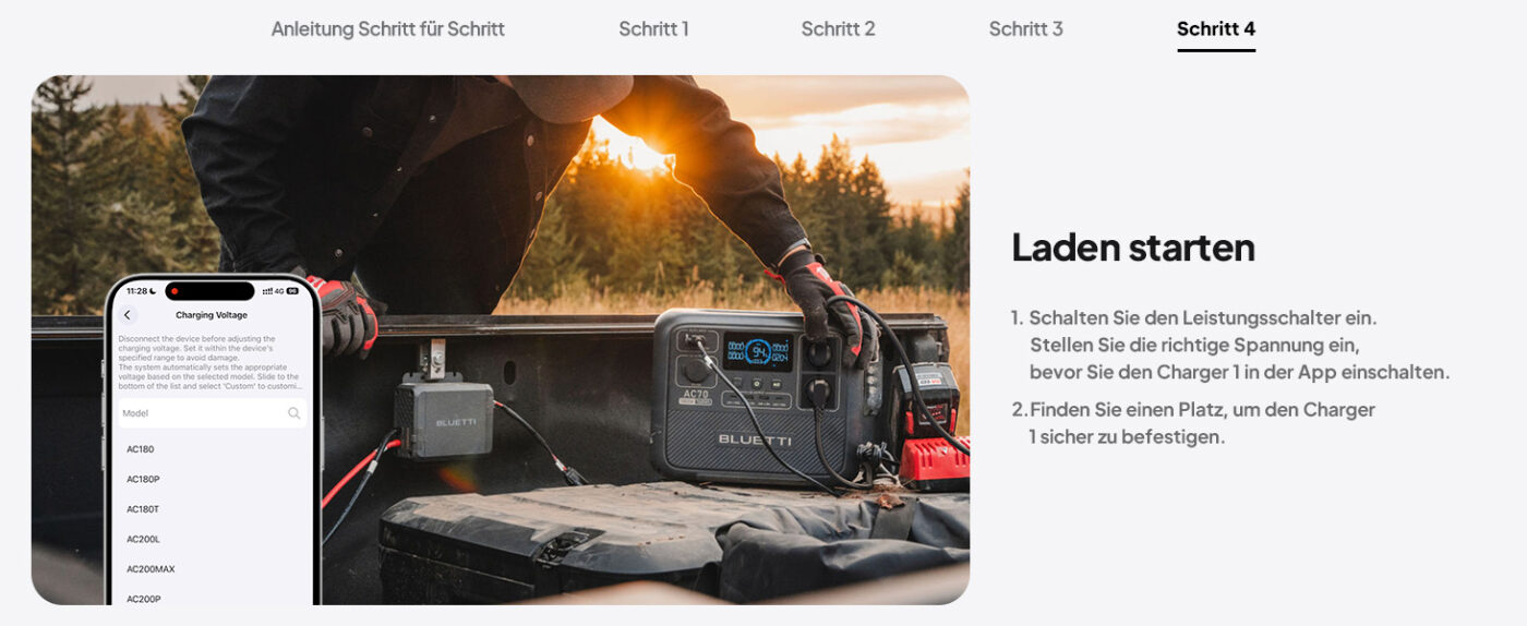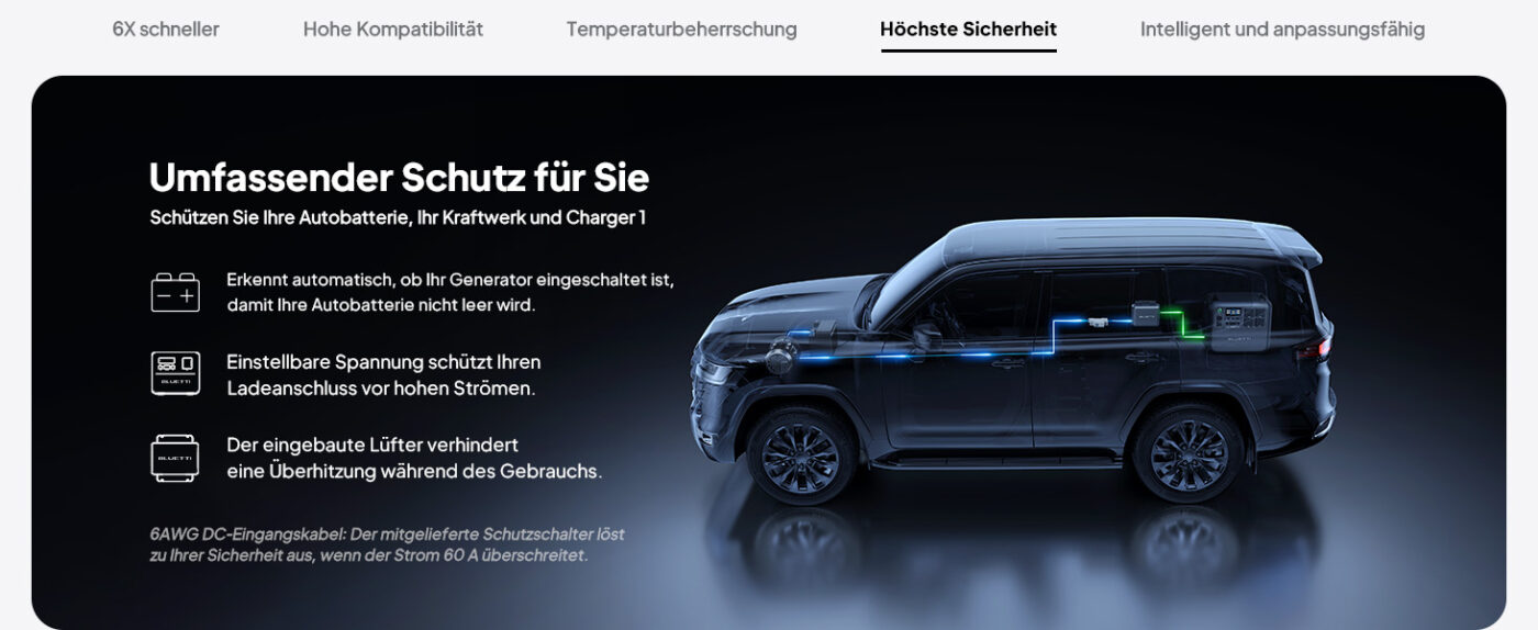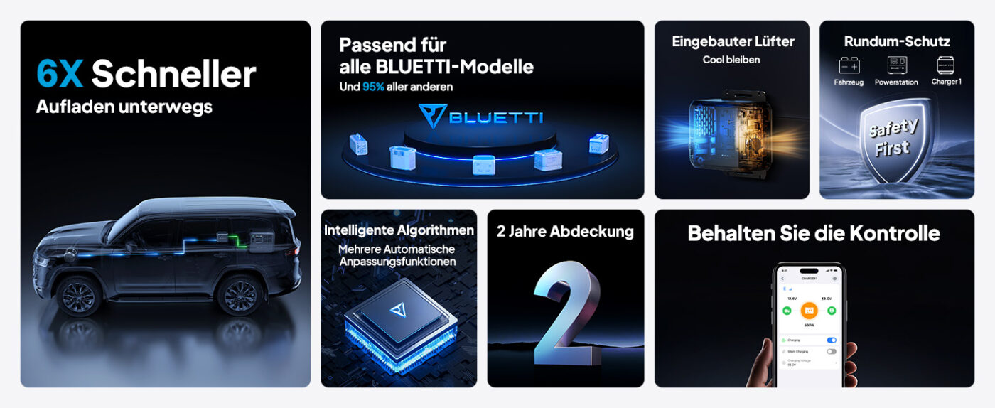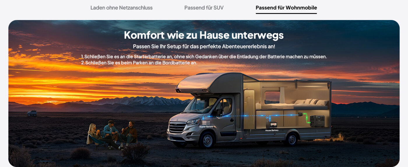 Absolut! Der Charger 1 ist die perfekte Lösung für Wohnmobilbesitzer und Vanlife-Enthusiasten. Während Sie durch Deutschland und Europa reisen, lädt der Charger 1 Ihre Powerstation automatisch auf — mit 560W statt nur 100W über den Zigarettenanzünder. Mit dem intelligenten Batterieschutz müssen Sie sich nie Sorgen um Ihre Starterbatterie machen. Kombinieren Sie ihn mit einer BLUETTI AC200L oder Elite 200 V2 für maximale Autarkie unterwegs!