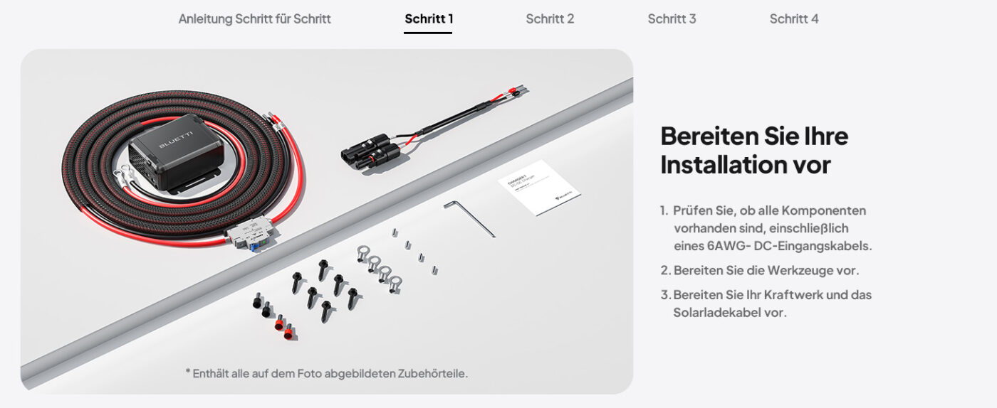 Das Paket enthält: den Charger 1 (DC-DC-Ladegerät), ein DC-Eingangskabel 6AWG für den Anschluss an die Fahrzeugbatterie, ein MC4-Ausgangskabel, Installationszubehör (Schrauben, Befestigungen) und die Bedienungsanleitung mit ausführlicher Installationsanleitung.