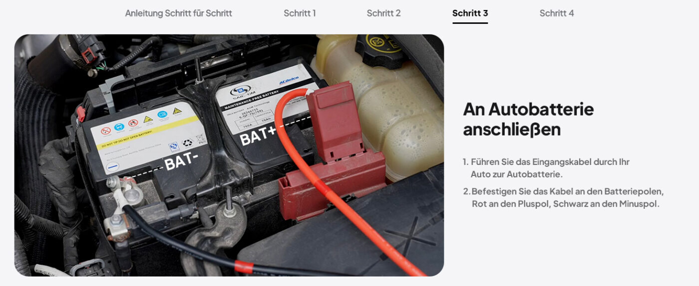2️⃣ Befestigen Sie das Kabel an den Batteriepolen: Rot an Plus (+), Schwarz an Minus (-)