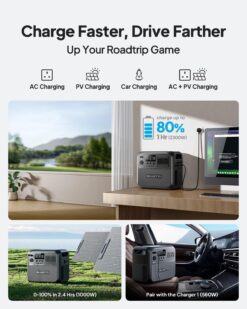 L’AC200L atteint 80% de charge en seulement 45 minutes via secteur (2400W max). En solaire, avec 1200W d’entrée MPPT (1,7× plus rapide que l’AC200P), elle se recharge complètement en 1,7-2,2 heures. La charge combinée CA+PV peut atteindre 3400W pour une recharge ultra-rapide.