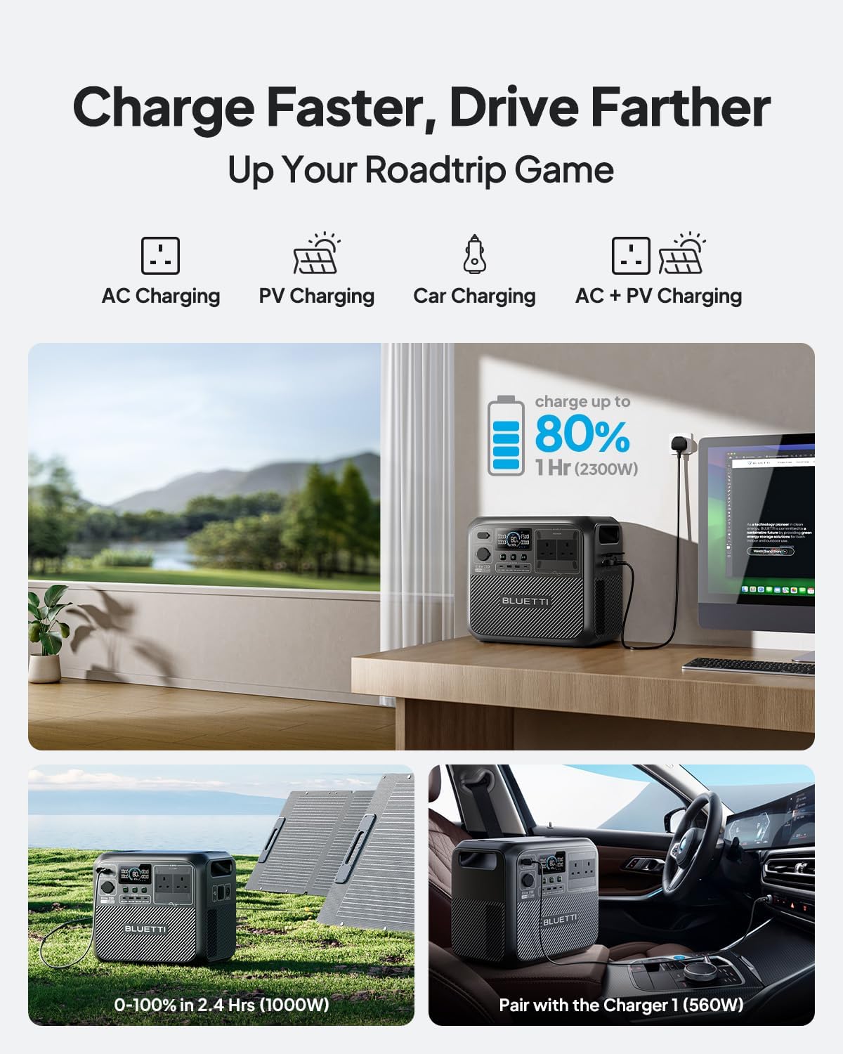 MPPT intégré pour une efficacité maximale. Rechargez complètement en 1,7-2,2h avec des panneaux solaires adaptés.