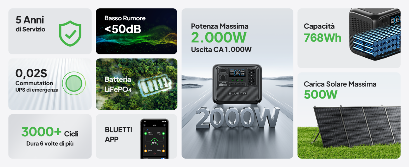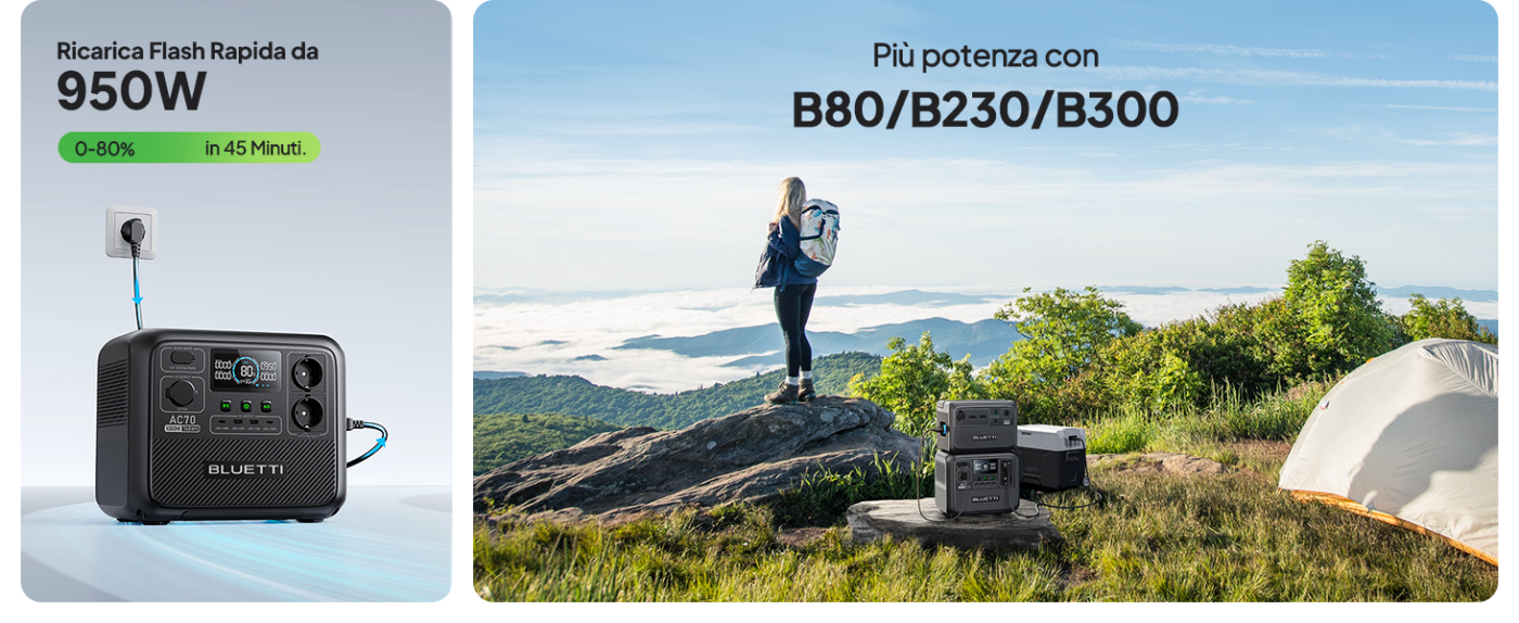 Con 768Wh di capacità e 1000W di potenza continua (Power Lifting 2000W), l’AC70 ti accompagna ovunque: campeggio, camper, lavoro all’aperto o backup domestico.
