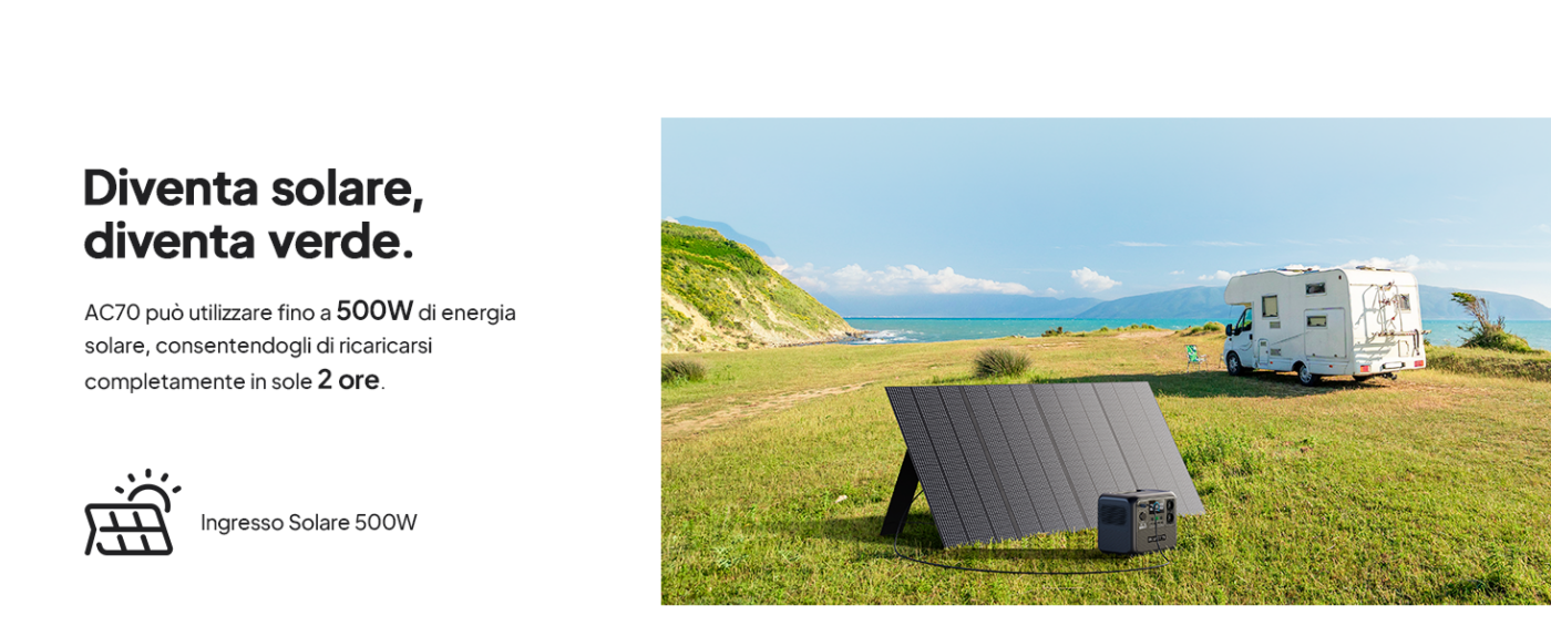 Nessun adattatore ingombrante necessario. Un semplice cavo basta per caricare l’AC70 con una potenza massima di 950W. Ricarica completa in sole 1,5 ore.