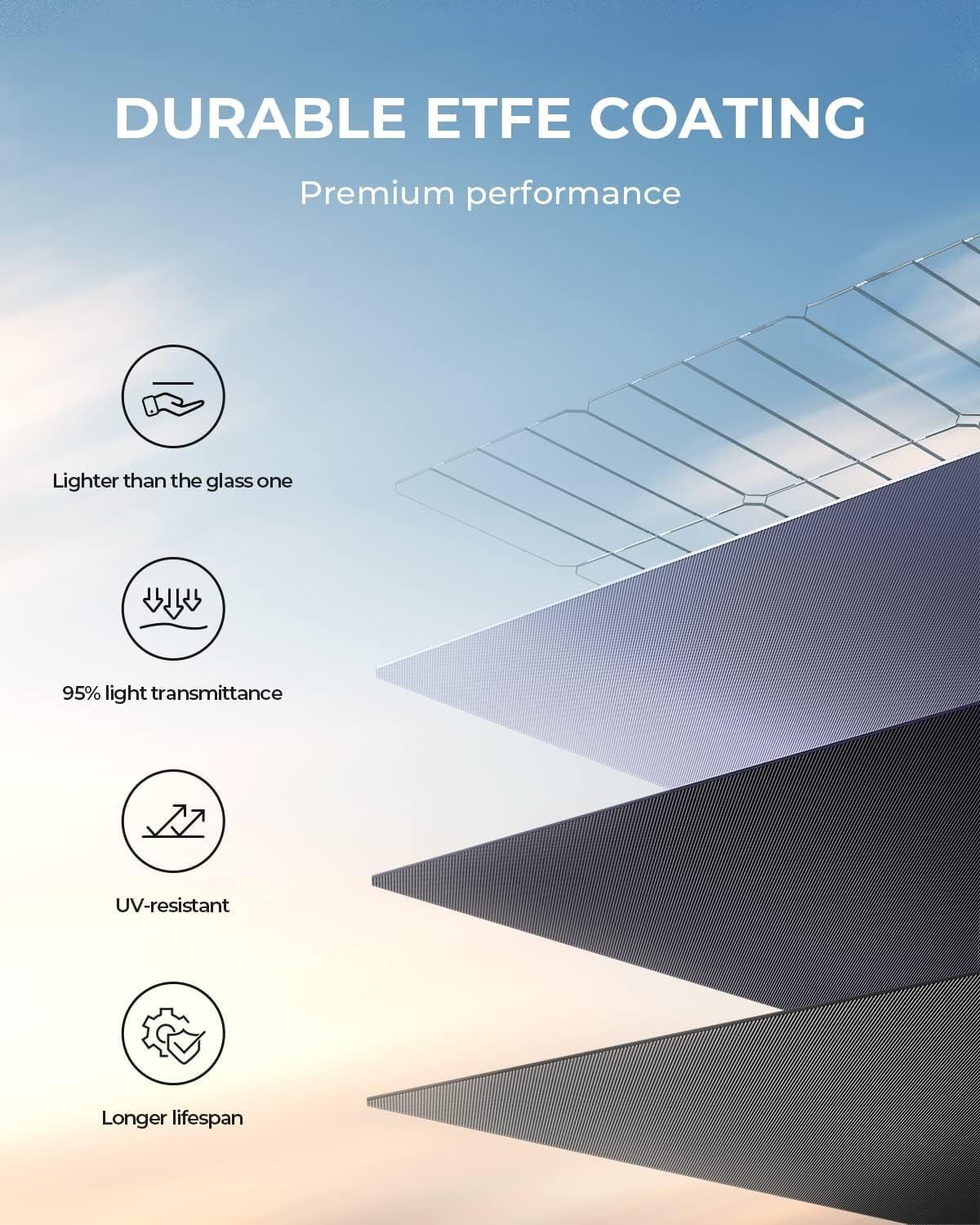 Le panneau solaire BLUETTI 350W exploite des cellules monocristallines de dernière génération avec un rendement de conversion de 23,4%. Cette efficacité supérieure signifie plus d’énergie captée par mètre carré, même par temps nuageux ou en hiver.